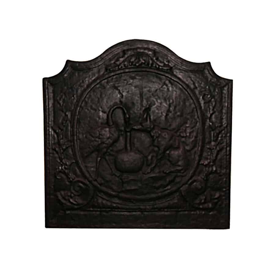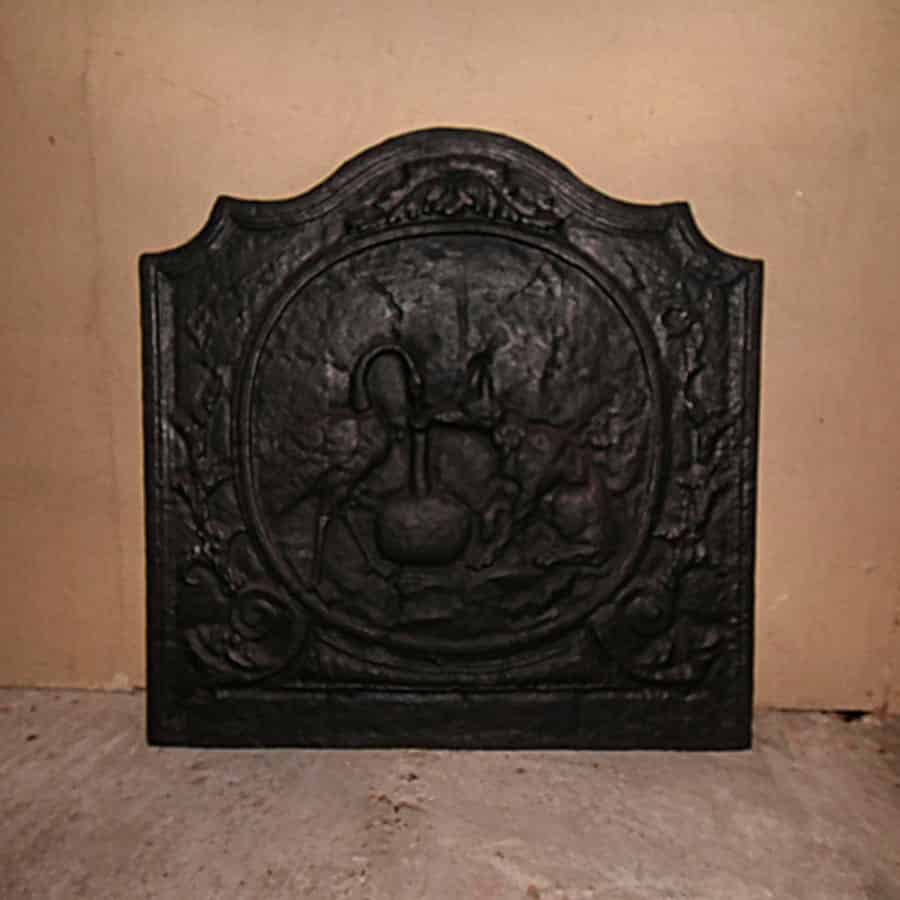 Antique hearth plate, or backplate. Decorative and functional as a back wall/protection of the fireplace and reflection of heat/extra efficiency. ’t Achterhuis has an ongoing collection of 250 antique cast iron fire plates. These are also called cast-iron fire plates with the function of reflecting heat and protecting your stone firebox. Usually, these plates are in perfect condition. Antique plates with a crack are restored by our very own blacksmith.
