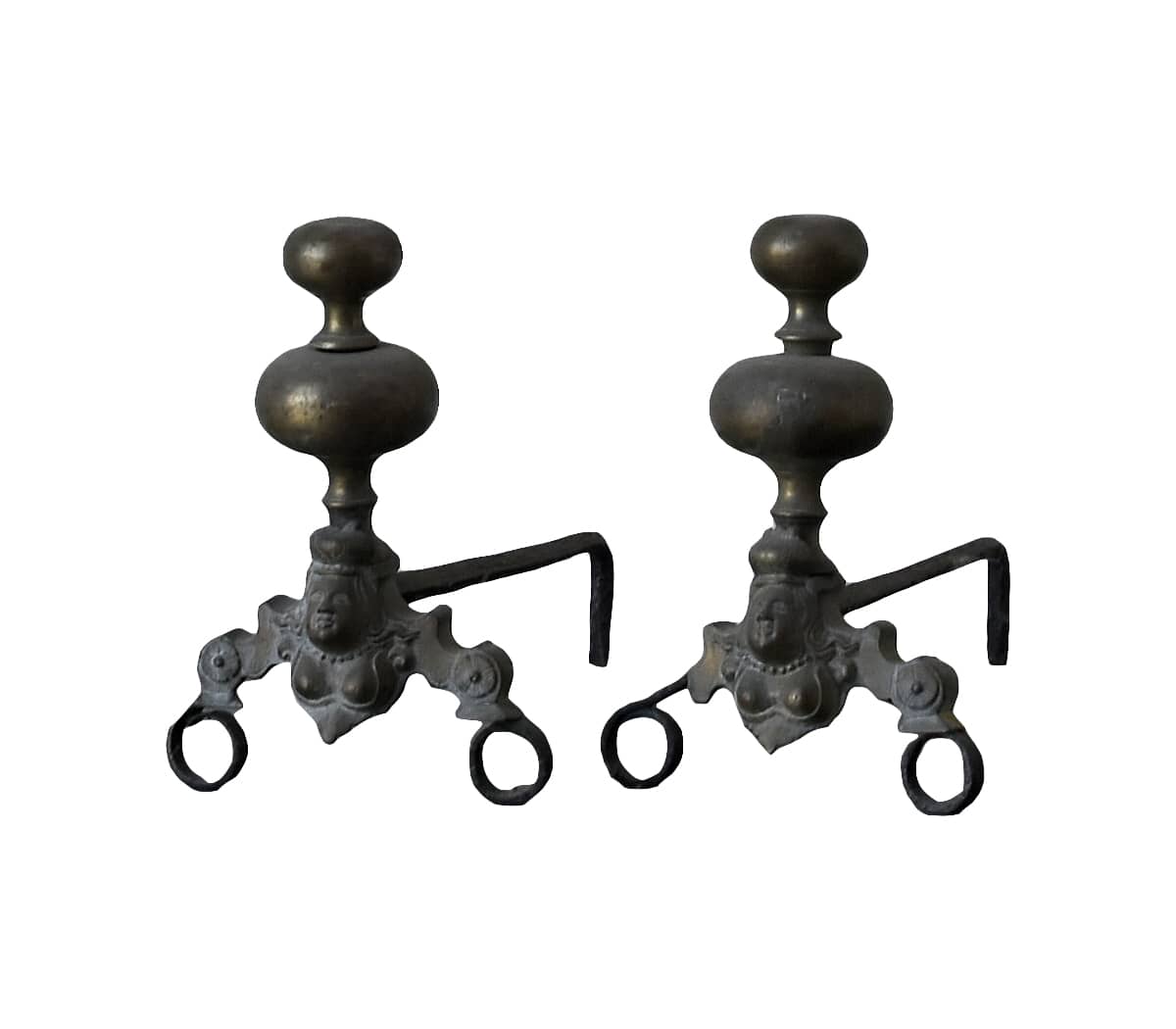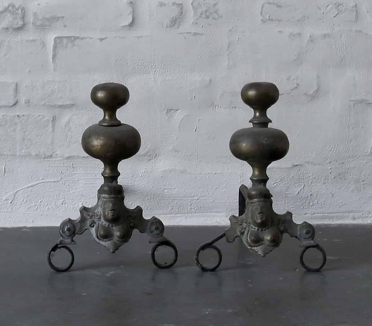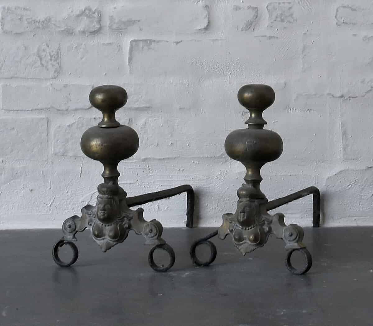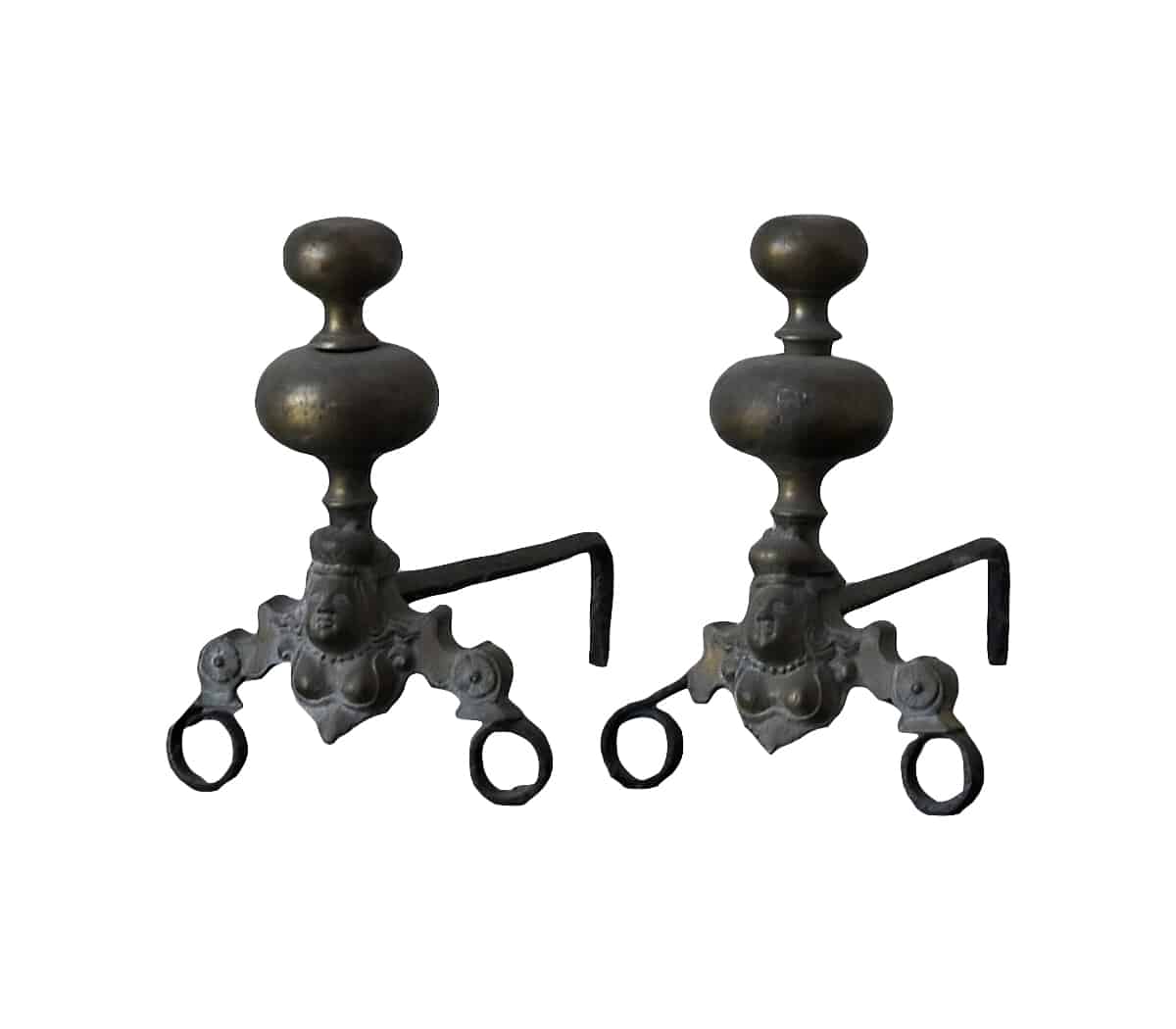 Antique cast iron firedogs, or andirons, which are used to keep up the fire grid on which the wooden logs are put. This makes for a better supply of oxygen and a better fire.