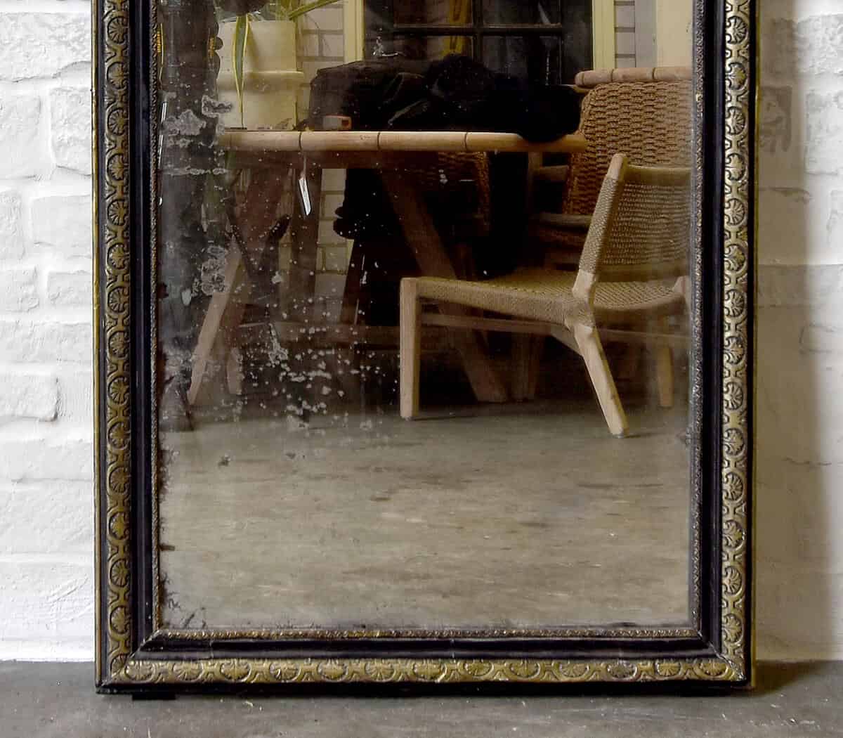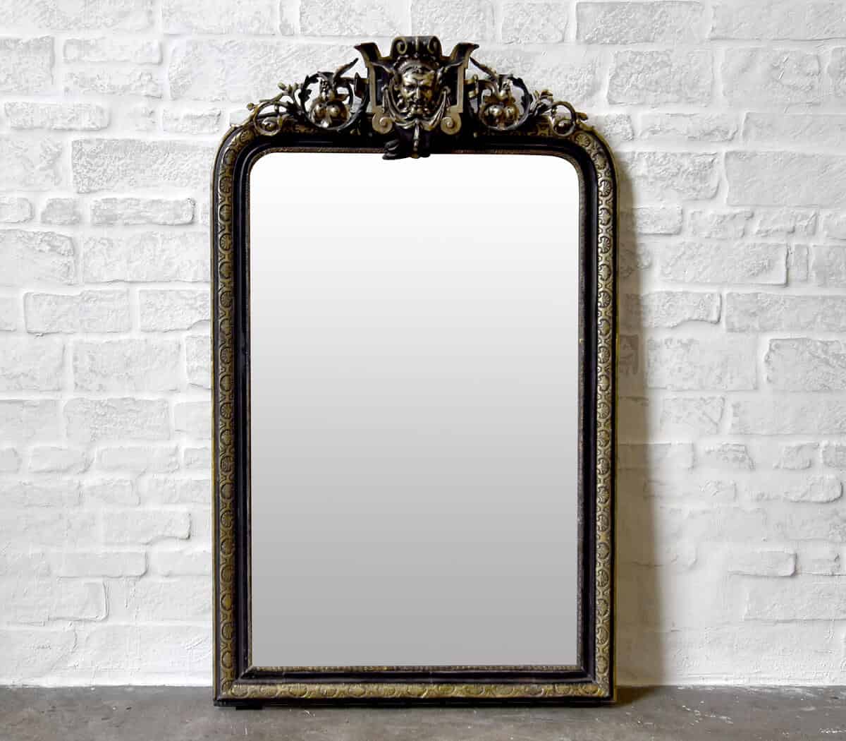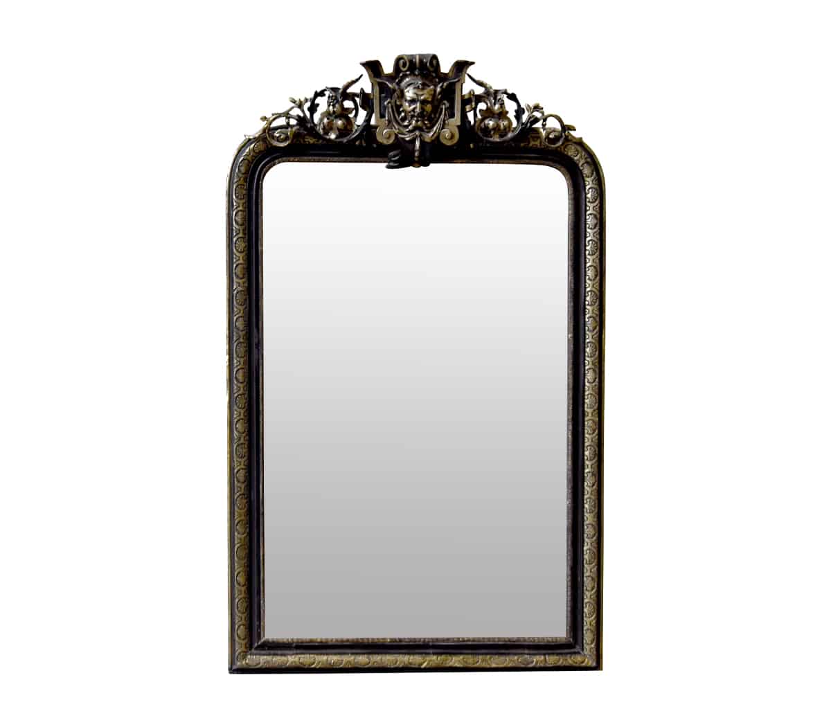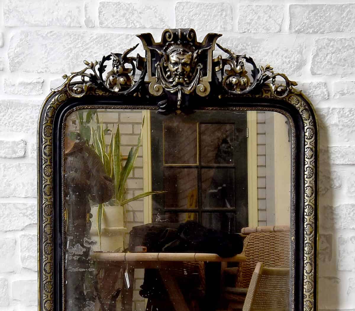 This antique mirror has, an ornament a nicely decorated frame and aged mirror glass.