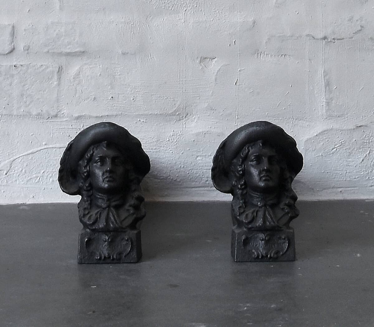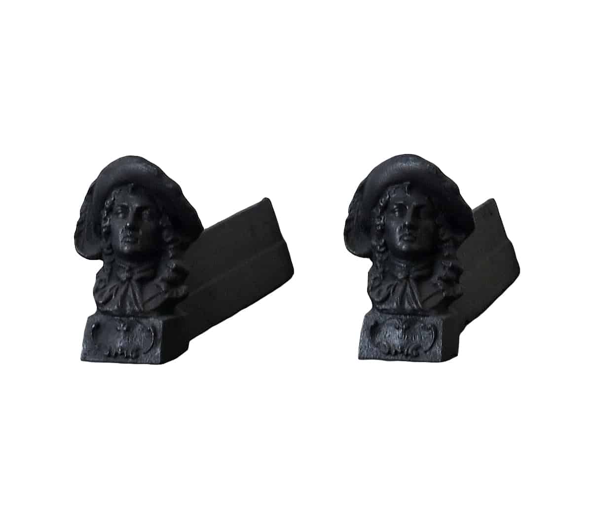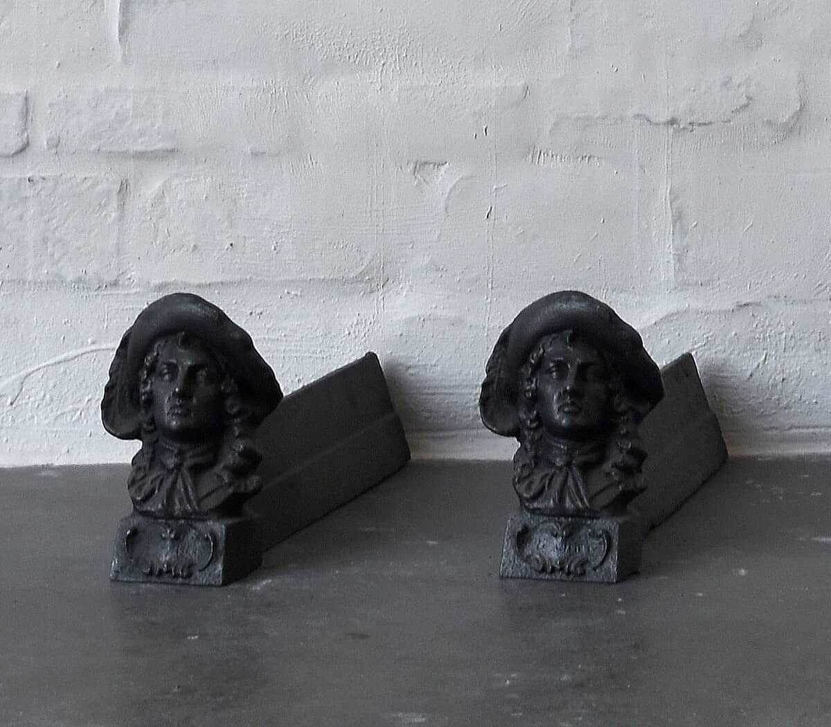 Cast iron andirons, or firedogs, which are used to keep up the firegrate on which the logs are put. This makes for a better flow of oxygen and thus a better fire.