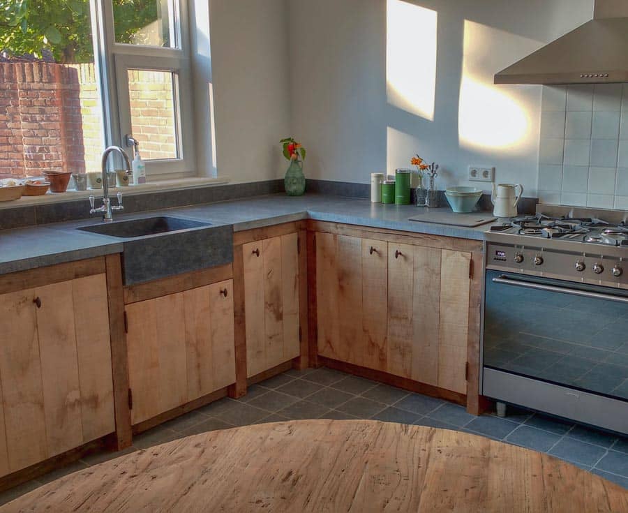 HomeMaatwerk keuken van oud eiken en Belgisch hardsteen